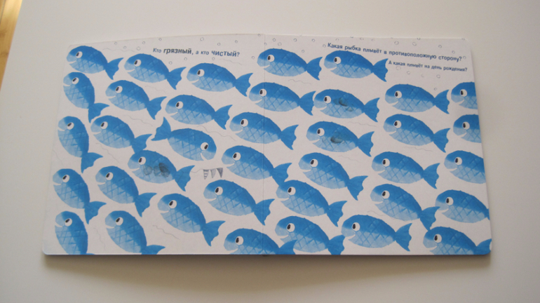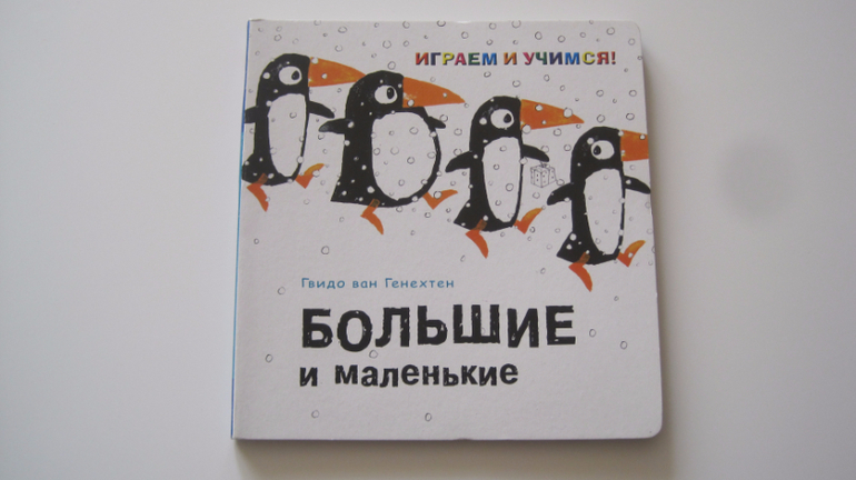 Далее интересная книжка, которая редко встречается в обзорах. Большие и Маленькие, Гвидо ван Генехтен. Поскольку мы сейчас активно интересуемся всеми противоположностями (большой-маленький, толстый-худой, длинный-коротки и итд), то купила, чтобы разглядывать и тренироваться. Это книжка-картонка, где на каждом развороте нужно найти кого-то, кто отличается от других по какому-нибудь одному или нескольким признакам. например все спят, а один нет. Крокодилы - короткие и длинные, пингвины - толстые и худые, рыбки чистые и грязные. Разворотов вполне много, есть где развернуться и порассуждать. Однозначно рекомендую. Хотя иллюстрации (для меня опять же) оставляют желать)