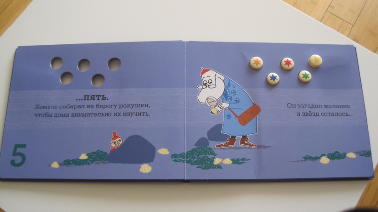 ну и Мумми Троли! Куда ж без них! Мумми Тролей Артур обожает, знает всех участников этой сказки, и нежно любит их всех:-) У нас уже была зачитанная до дыр и купленная во второй раз книжка с окошками " С утра до вечера", и "Веселые прятки" до сих пор очень любима. И вот еще один хит - "Мумми Троли считают звезды". Тут надо еще учесть тот факт, что Артур очень полюбил все считать. Цифры очень его интересуют равно как и количество предметов. Он пока умеет говорить только "один", но цифры до 10 уже все узнает, и очень часто заставляет меня считать разные предметы. Поэтому эта книга пришлась как нельзя кстати. Сюжет книги в том, что на небе было 10 звезд, и разные участники книги загадывали желания и звезд становилось на одну меньше. Книга прекрасно оформлена, звезды - выпуклые пластмассовые и разноцветные. Можно читать, можно считать, можно трогать, можно показывать цвета... В общем, прекрасная книжка!