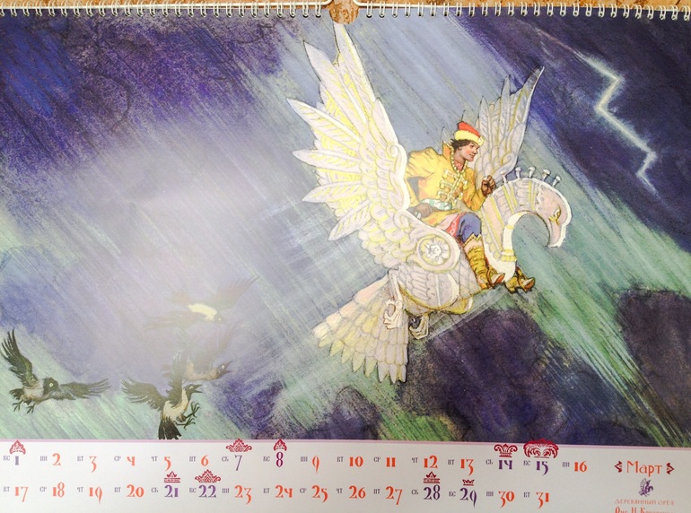Сейчас ещё дома висит календарь от "Речи" с рисунками Н. Кочергина, и на месяце марте у нас как раз иллюстрация к этой сказке. Поэтому Марта периодически поглядывая на календарь рассказывает мне, что царевич летит спасать царевну из башни:))))