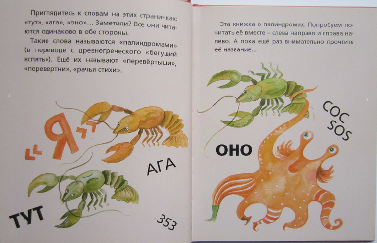 Так как моему книгоманьячеству всего лишь третий год, то ассортимент издательств более раннего периода до сих пор преподносит мне сюрпризы! Всего лишь дней 10 назад, разыскивая материал о палиндромах, я наткнулась на весёленькую книжку, иллюстрации - такие узнаваемые! А вся-вся книга посвящена именно палиндромам! Моему удивлению не было границ, когда я выяснила, что у издательства "Розовый жираф" начиналась серия книг о языковых явлениях! Всего 2 книги вышли в серии, обе с иллюстрациями Дарьи Герасимовой) Я-то всё смотрю на её азбуки-алфавиты, а оказывается у неё вот что было!!!