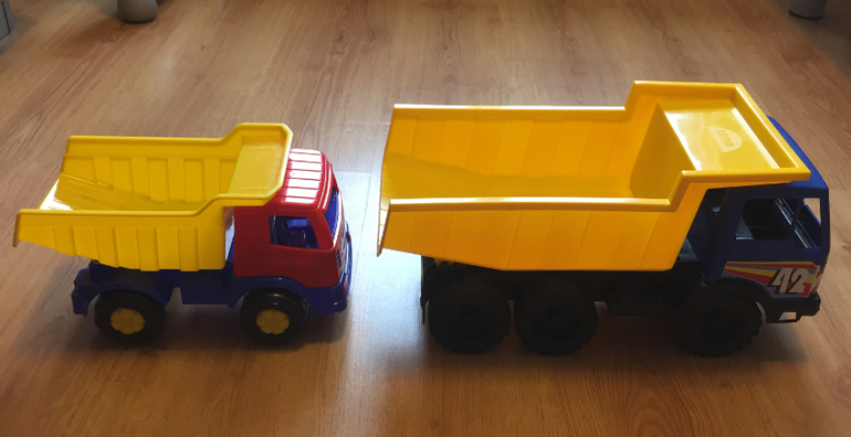 На днях приносит два игрушечных самосвала, ставит передо мной и говорит: "Два самосвала. Один побольше, другой поменьше". Потом после небольшой паузы: "И стучат, - приподнимает кузовы и стучит ими по самосвалам, - Бум-бум-бум".