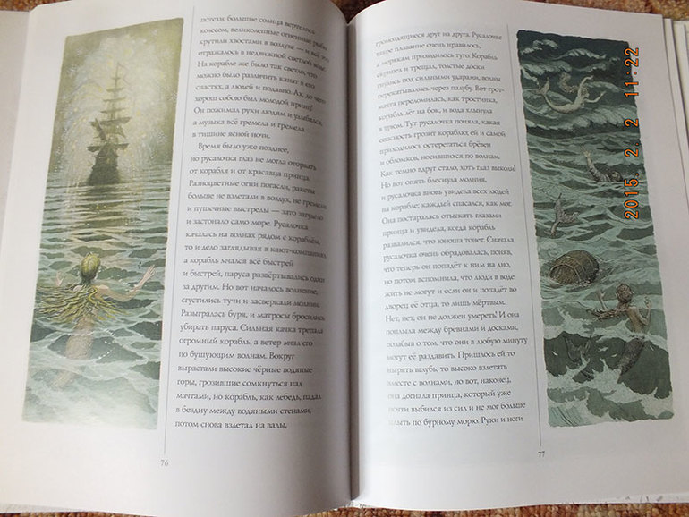В первый же день, когда я получила книгу, не могла от нее оторваться. Обложка такая, что из рук выпускать не хочется, с тканевой фактурой. Но не ткань, не как у сказок от Речи. И рисунки мне, взрослой тете, понравились. Не детские, однозначно. Но вот есть что-то в этой книге такое, что заставляет снова и снова брать ее в руки. Честное слово. Пока писала пост и фотографировала книги, восторгалась Бирмингемом и Гольц, а ручонки тянулись к Диодорову. Взрослая книжка. Русалочка красивая. Наш папа правда сказал, что уж очень натуралистично.