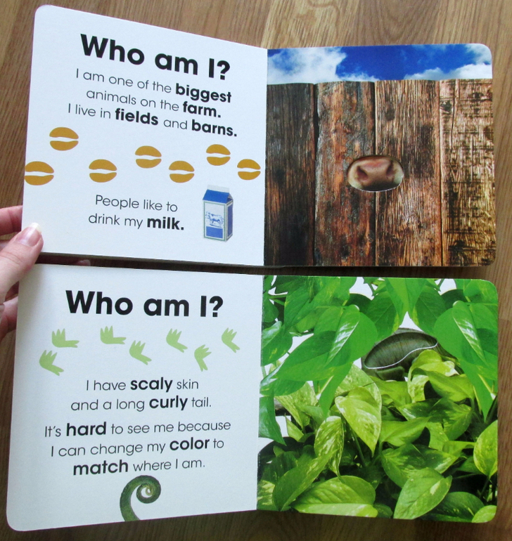 Книги с вырубками, через которые виден только кусочек животного, ребенку предстоит узнать кто именно там спрятался. Разгадка на следующем развороте.