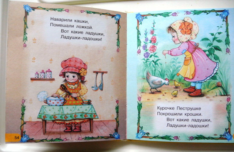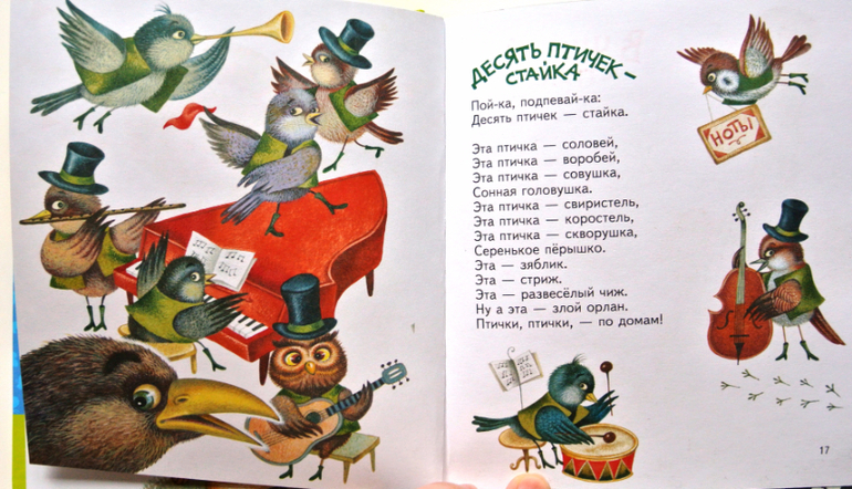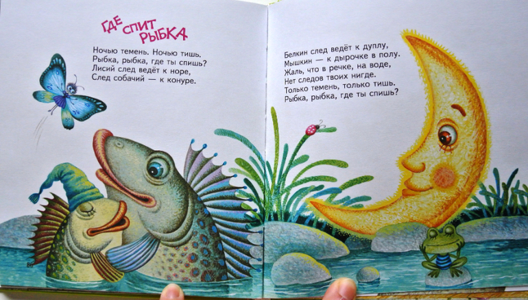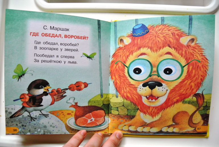 Удобный маленький формат так хорош для еще неловких ручек! Плотная белая бумага. Отличная подборка стихов! Есть совсем короткие, четверостишие на разворот, а есть достаточно длинные. Иногда читаю фоном все подряд, если Сашка на коленках, я читаю, что успею в любом месте, она вырывает, полистает, потом ко мне попадает книга, я открываю в новом месте и читаю, длинные читаю не полностью одно - два четверостишия. Часто Санька просто берет и сидит листает (это касается всех книг, что мы читаем, еще нравится листать те, которые с Мишкой читали).Это стихотворение полюбилось с первого раза:
