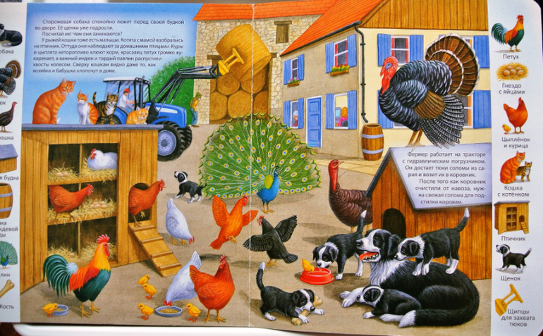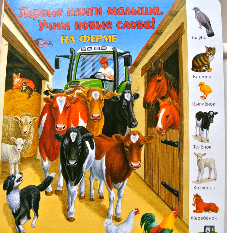 Книги издательства Улыбка. (в лабе, в озоне, в майшопе) Когда они вышли было море постов про них, я сразу же все книги серии купила. Сейчас с Санькой смотрим только про животных. В книге про ферму деталей меньше всего, изображено все достаточно крупно и реалистично.