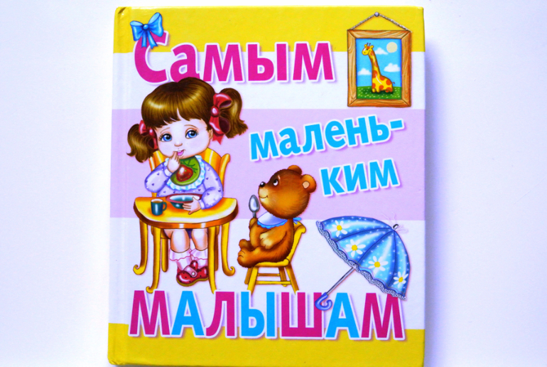 Удобный маленький формат так хорош для еще неловких ручек! Плотная белая бумага. Отличная подборка стихов! Есть совсем короткие, четверостишие на разворот, а есть достаточно длинные. Иногда читаю фоном все подряд, если Сашка на коленках, я читаю, что успею в любом месте, она вырывает, полистает, потом ко мне попадает книга, я открываю в новом месте и читаю, длинные читаю не полностью одно - два четверостишия. Часто Санька просто берет и сидит листает (это касается всех книг, что мы читаем, еще нравится листать те, которые с Мишкой читали).