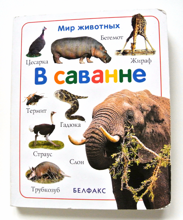 Маленькая картонная книжечка, хорошего качества. Развороты с множеством животных и птиц чередуются с разворотами, посвященными только одному животному (слоны, страусы, львы, жирафы), названия животных достаточно экзотические, я читаю как есть, вдруг запомнит;) На белом фоне. Сашке нравится, ходила тут с ней, мне пихала, читай, мол! а такое редко случается!