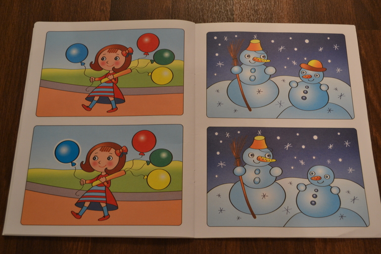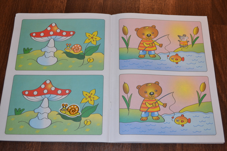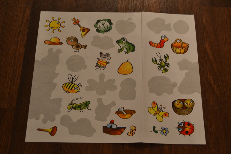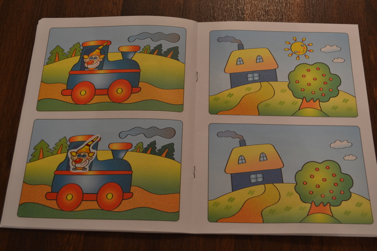 Не просто хит, а хитяра! )) На одном листе две одинаковые картинки, только на нижней не хватает детальки. надо найти ее среди наклеек и приклеить в соответствующее место. Рассматриваем с дочерью картинки, а потом прошу дочь найти среди наклеек необходимую. Дочь ищет, я отклеиваю, даю ей в ручку, она «жамкает» ее, потом я наклеиваю. Сколько же у меня радости, когда дочь находит нужную детальку!