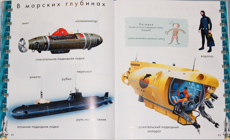 Текста здесь почти нет. Есть небольшое число вопросов на наблюдательность, не имеющих большей роли. В книге охватывается широкий спектр средств передвижения от пиратских галеонов до космических кораблей. Ориентирована на получение представления о видах транспорта для ребенка 2-5 лет. Здесь нет ничего лишнего, никакого избытка всех видов плав-средств или всевозможных моделей танков - а танки в этом сборнике тоже представлены. Это такой необходимый и достаточный минимум, который воспринимается без напряжения. Страницы украшены разнообразным тематическим орнаментом по краю. См примеры внизу. В конце книги алфавитный указатель транспортных средств.