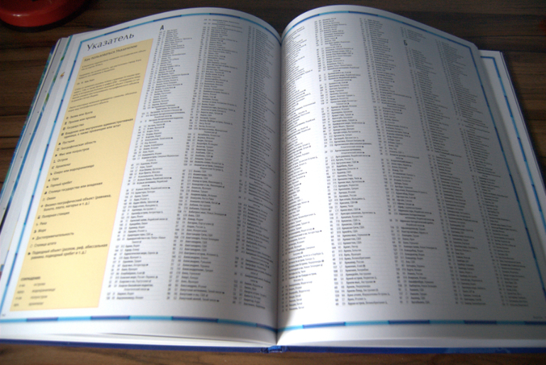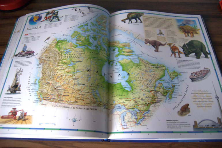 Осторожно! Он огромный! Действительно, очень большая увесистая книга. Качество полиграфии на 5+. Плотная мелованная бумага, качественный переплет, иллюстрации на высшем уровне, красочные и многочисленные. Форзац и нахзац оформлены как карты-содержания, для территорий проставлены страницы, где они описываются в атласе.