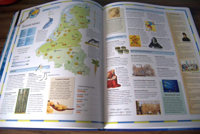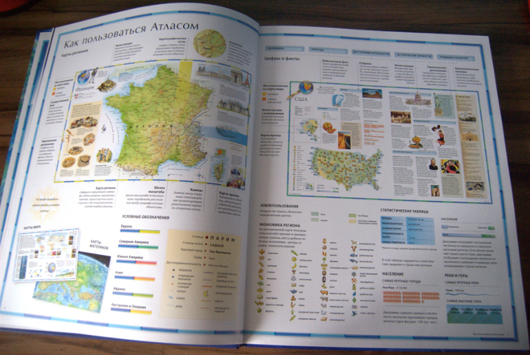 Но при всех его некоторых минусах, плюсы определенно перевешивают. За счет большого формата карты даны весьма подробно для рассмотрения. Информации на разворотах тоже представлено в изобилии, подобрана она оптимально, нет особой перегрузки фактами, но при этом описания достаточно подробные. В Атлас включены множество карт, в том числе физическая и политическая карты мира, затем идет уже подробное представление стран и континентов, включая интересную информацию об истории стран, традициях и культуре, о животном и растительном мире. То есть в целом Атлас красив и полезен, хотя до идеала и не дотягивает. Кстати, соотношение цена-качество очень достойное, если брать под акцию так вообще получается очень дешево.