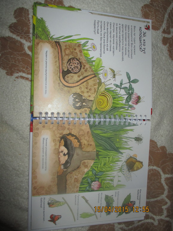 Серия ЗОП уже изрядно раскуплена и этот факт очень печален. На нее, как и на данное сообщество я наткнулась совсем недавно, и когда увидела эти книжки, то в наличии их уже осталось мало. Последняя надежда была на Рид, где в феврале были "Автомобили" под заказ, заказала, но не пришли, закончились у поставщика(( Купили про животных. Особенно любит эту книжку сын. Это видно по корешку) Особенно эту страницу, где червячки)