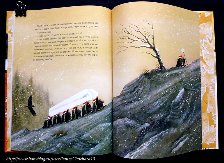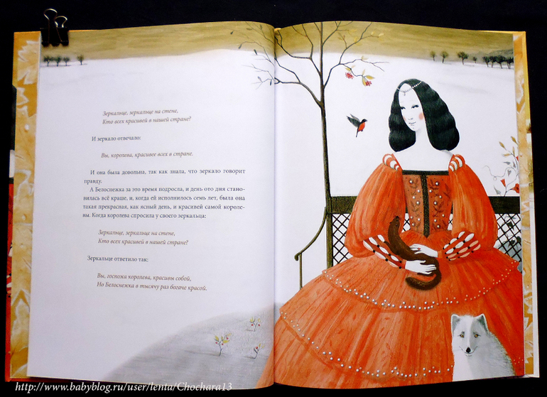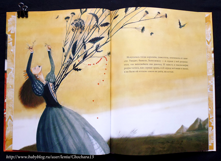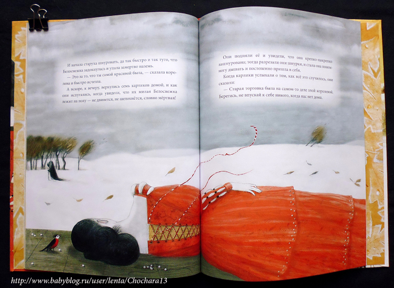 И эта книга про Белоснежку привлекла меня именно своими стильными рисунками Марии Михальской: господство охры и красные акценты на каждой странице. Всё очень продумано и образно.