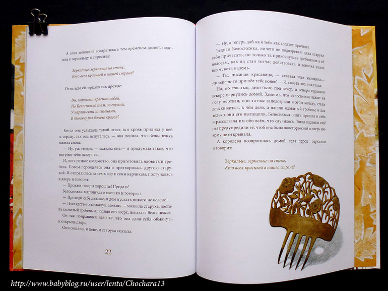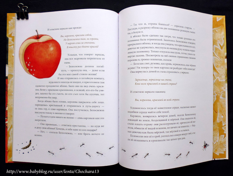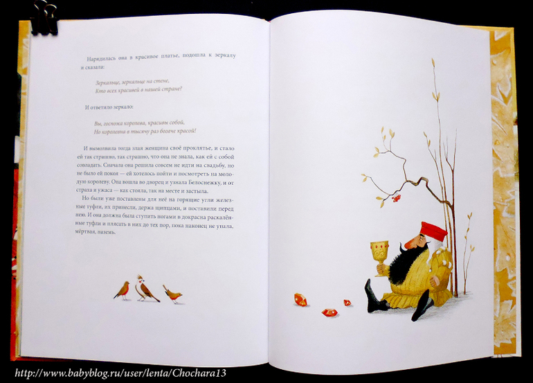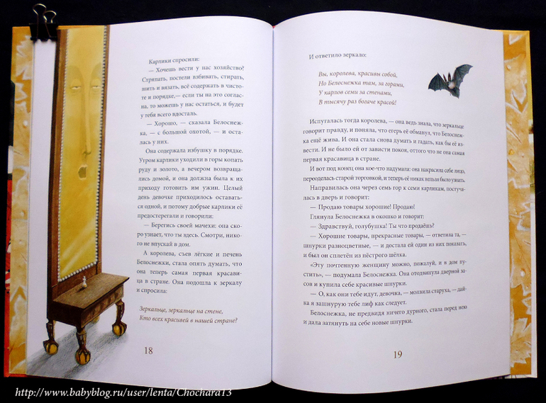 Но в целом книга очень стильная. Хороший язык, классический перевод, без сокращений, все моменты отображены. Отдельно выделены рифмованные слова зеркала, которые немного отличаются от привычных нам строк по тому же Пушкину, или по мультфильмам. Но смысл тот же.