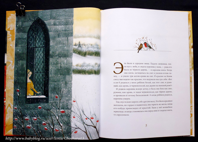 Единственное, что меня смутило, как взрослого человека, - это явное несоответствие семилетней Белоснежки её образу на рисунке - уж больно она там "стара" для своих нежных семи лет. Я, конечно, понимаю, что в те времена и Джульетта вышла замуж в 13 лет, а с семи её уж точно морально и внешне готовили к будущему браку, но если бы придать Белоснежке на первой иллюстрации, где она встречается, чуть больше детской округлости в лице - цены бы этому образу не было! А так получилось, что её образ остался неизменным до самой свадьбы, хотя замуж выходила она уже через несколько лет.