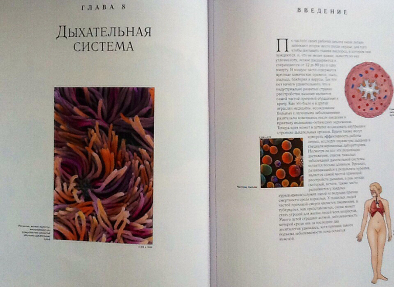 В энциклопедии очень много красочных иллюстраций.. Изображения демонстрируют строение тела и показывают, как функционируют те или иные органы тела. В книге так же есть изображения полученные с компьютера и микроскопа.