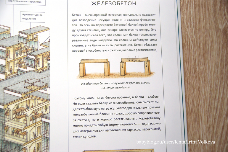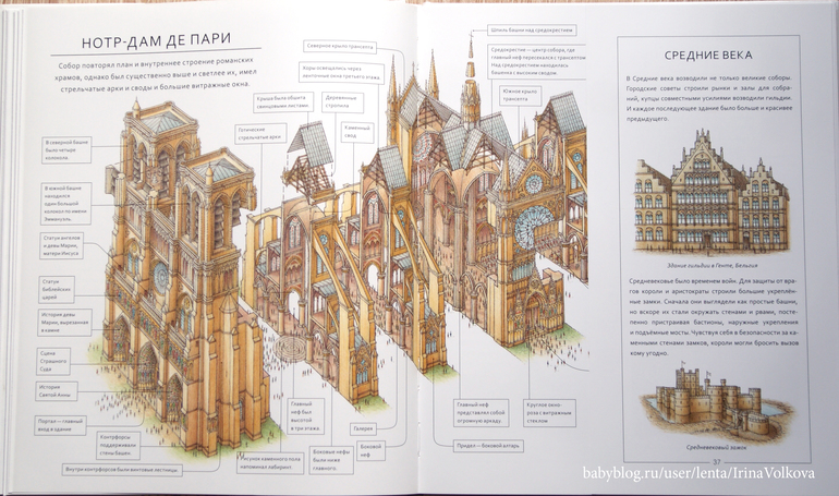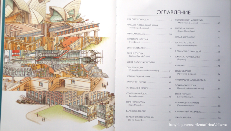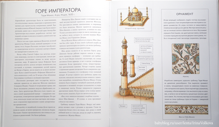 На протяжении всей книги читателю встречается большое количество архитектурных терминов, но в информации нет перегрузки. Хотя конечно читать нужно дозировано. Мы с дочкой читали об одном сооружении в день. Если я видела, что ей что-то неинтересно и она заскучала, то опускала текст и мы просто разглядывали с ней рисунки. И воображали себя жителями этих построек! А позже обязательно вернемся с ней к этой книге, потому что потенциал у нее огромный!