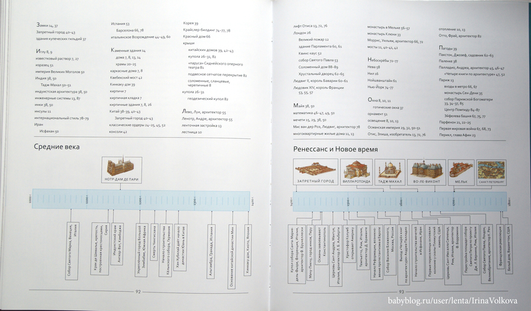 В конце книги так же есть алфавитный указатель терминов и шкала времен- указатель дат постройки архитектурных сооружений, которая проиллюстрирована видами зданий. Очень понятный формат для детей! По такой шкале можно будет собрать все знания воедино и понять в каком русле развивается архитектура, и додумать - что же будет дальше! А дети такие изобретатели!