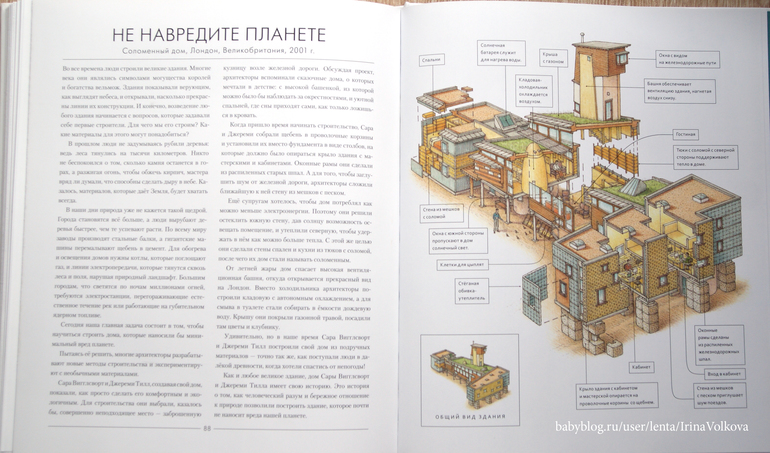 А еще мне очень понравилось, как заканчивается эта книга! На сегодняшний момент проблема экологии и сбережения энергии стоит особенно остро. А дом Сары Вигглворт и Джереми Тилл показывает, как можно создать жилище из необычных материалов. И оно будет комфортным и экологичным. Отличный пример для будущих архитекторов!