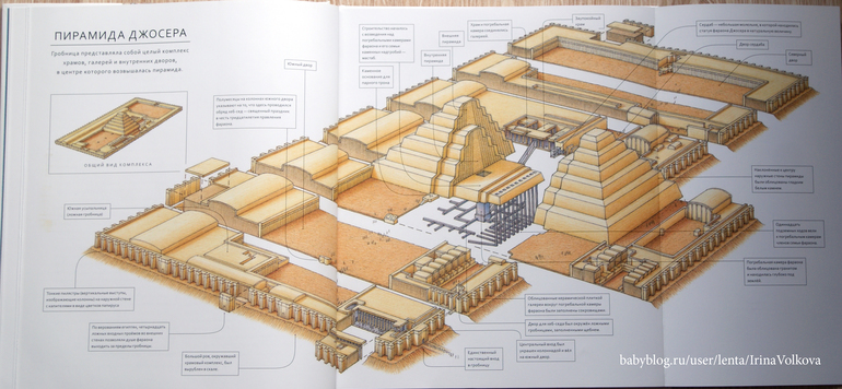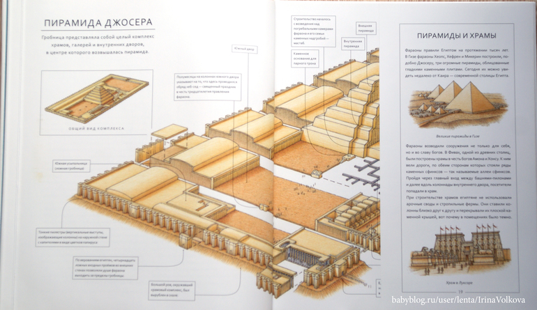 Начинается повествование о фараоне, который так мечтал победить время. О каждом объекте даются сначала исторические сведения и увлекательный рассказ, а потом идет разворот с картинкой, на которой большее внимание уделяется его архитектурным особенностям. Подробнейшие иллюстрации Стивена Бисти дают возможность понять устройство сооружения. Объекты представлены в объеме, показаны сечения - разрезы. Все довольно подробно. На рисунках указаны ссылки на комментирующие факты. И мне понравилось, что показан масштаб сооружения - на каждой иллюстрации изображены люди. А это самый понятный масштабный указатель для детей, потому как цифрами оперировать им еще довольно сложно.