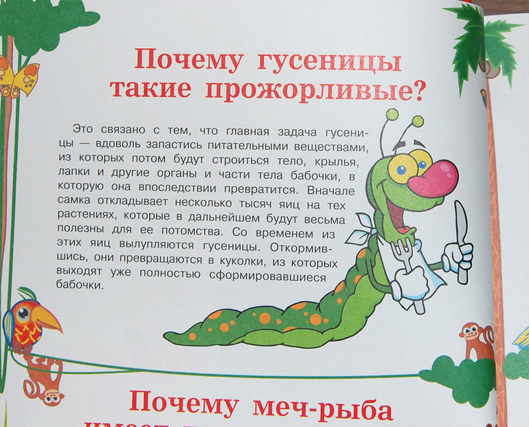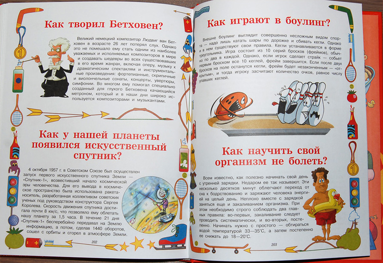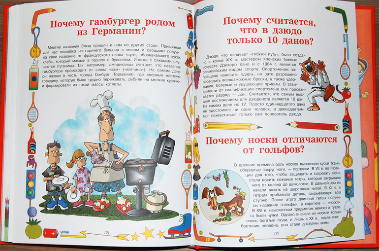 На некоторые вопросы выделена половина страницы, на некоторые целая. Каждый вопрос сопровожден веселой иллюстрацией. Кроме того края страниц оформлены тематическими орнаментами. Это просто праздник какой-то (с) - книга выглядит действительно празднично и ее не стыдно подарить, повторюсь, весомый довольно фолиант 200 плотных страниц офсета.