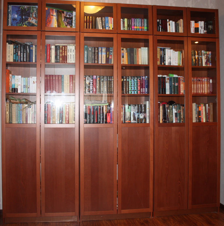 Честно говоря, мне не нравится как расставлены книги. Всё пытаюсь собраться с духом, разгрести все полки и расставить всё аккуратненько: по сериям, по росту... Но так уже привыкла к тому, где какая книга, что всё никак не решусь всё это разворошить... Так и стоят бедняжки вперемешку(((