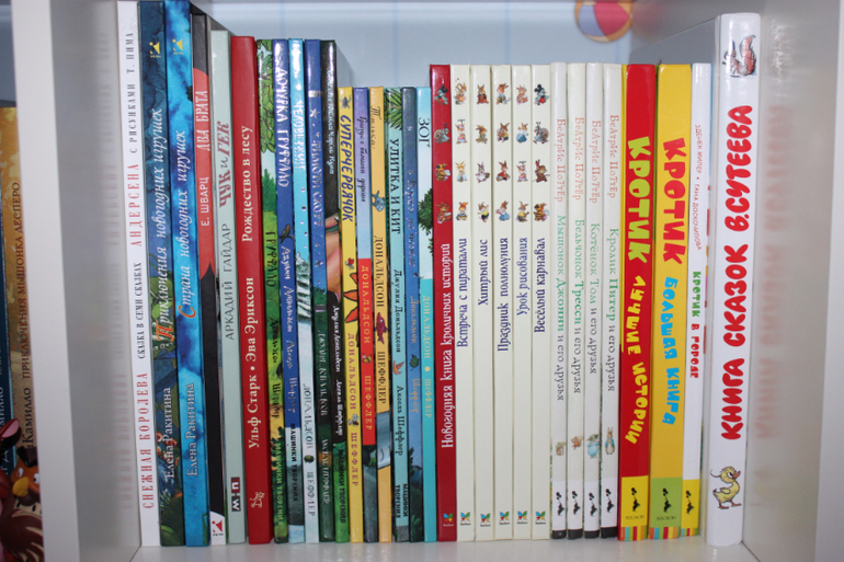 Здесь на полочках стоят самые часто читаемые книги и книги, которые ребёнок перерос, но по старой памяти иногда берёт в руки и пролистывает самостоятельно. Что-то читает (читает он пока только вслух, поэтому сразу понятно: действительно читает или просто картинки смотрит), а что-то просто проглядывает...