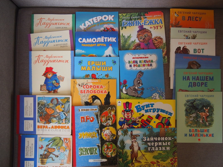 Тоненькие маленькие. Вот стали любить Паддингтона. Очень недорогие и хорошенькие книжечки. Самолетик, катерок тоже любим. Переодически перечитываем Чарушина, Веру и Анфису. Опять полюбили потешки.