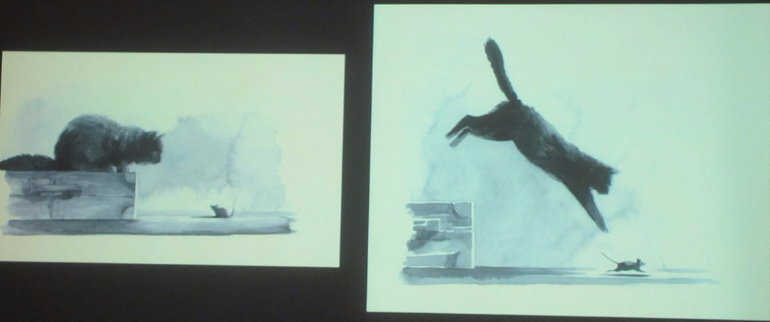 Два варианта иллюстрации к моменту охоты кошки на мышь. Как вы думаете, за какую голосует Торбен? Конечно же, за первую! Там есть интрига, недосказанность.