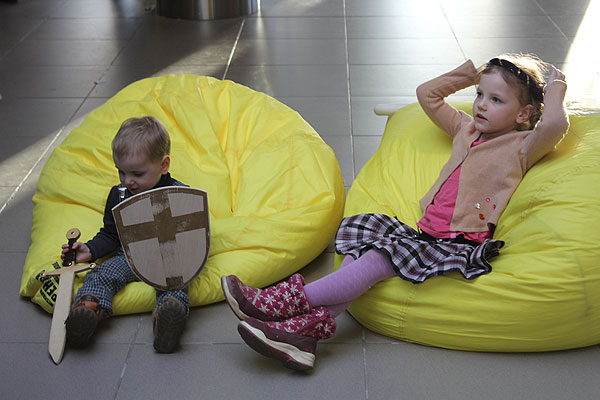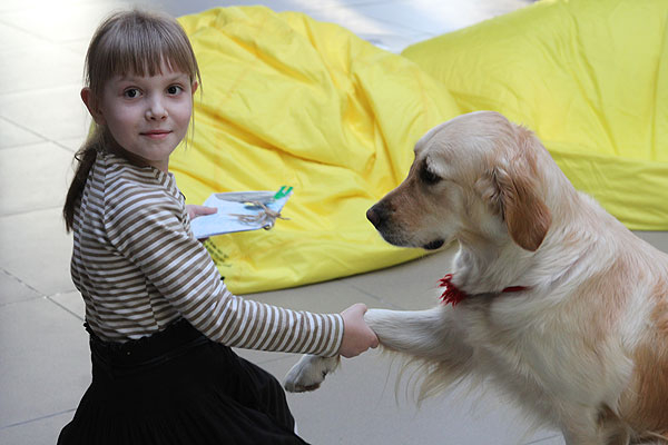 Для детей был устроен очень удобный уголок с вот такими креслами-мешками и читающей собакой :)