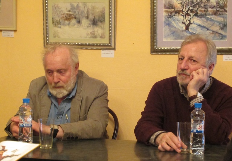 22 апреля общение проходило сразу с двумя мэтрами: Игорем Юльевичем и Юрием Борисовичем. То, что вдвоём, для меня минус. Редко получается дополнять идеально друг друга, кто-то будет говорить больше, кто-то будет стараться дать слово другому. Уже давно хотела попасть на встречу с Игорем Олейниковым, не получалось... Хотя "Вита Нова" подобные встречи проводит достаточно регулярно. И эта встреча не оставила удовлетворения именно из-за того, что "мало было" Игоря Юльевича. Чаще и дольше отвечал на вопросы Юрий Норштейн. Понимаю, что вопросы жизни страны, вопросы политики тесно связаны с развитием мультипликации и местом художника, НО... я шла на творческую встречу, а там и хочется слушать о творчестве! О нём я и напишу)