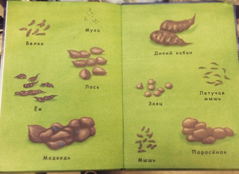 В книге жизнь леса от махаона тоже есть такой разворот. http://www.labirint.ru/books/116883/ И на мой взгляд нисколько не умоляет достоинств книги. Знакомый ребенок в лесу набрал целую кучу лосиного помета, решил что это орехи. У него такой книги явно не было ))))