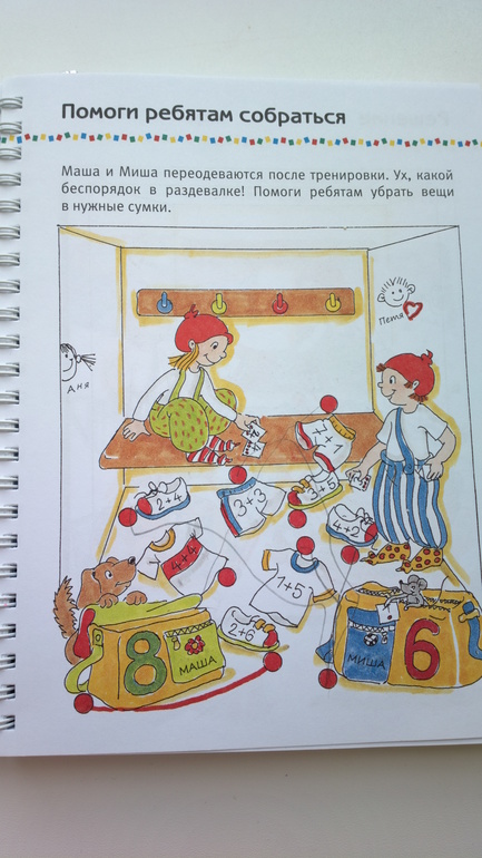 Посмотрите, опять интересный сюжет и опять можно поговорить на определенную тему, т.у каждое задание-это маленькая история про Маш и Мишу. (Вот тут, например, Маша и Миша переодеваются в раздевалке после тренировки. И это прекрасный повод поговорить с ребенком на данную тему. Мы обычно придумываем историю в таком духе - что дети делали на тренировке, куда пойдут после неё, но сначала выясняем что такое тренировка и т.д.)
