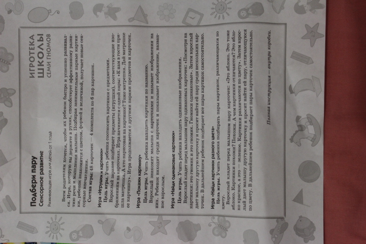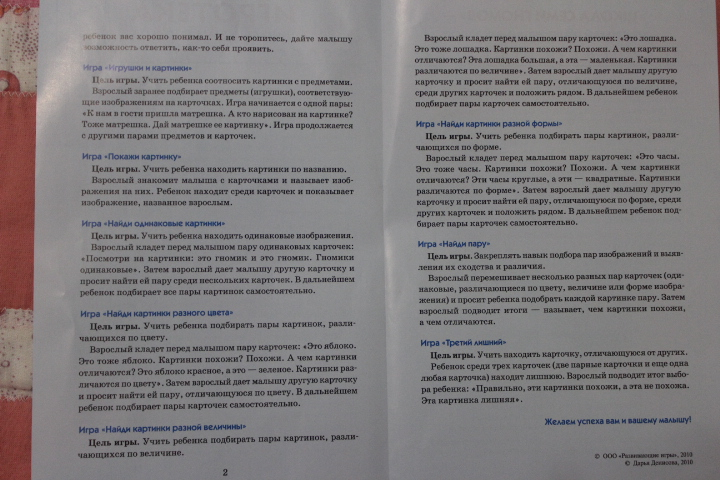 В принципе, подобные карточки можно и самим сделать, самим выбрать любимые картинки и сделать свою игротеку. В пособии также идет брошюра для родителей с вариантами игры.