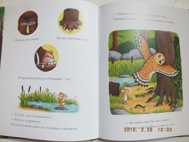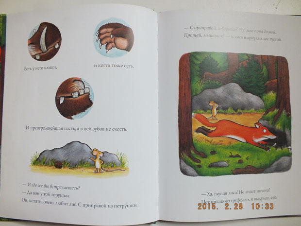 Книгу знают все, видели все. Нам очень нравятся форзацы. Там муравьи, бабочки изображены, которые потом в других книгах Дональдсон встречаются. А вообще герои Груффало были замечены нами во многих книгах.