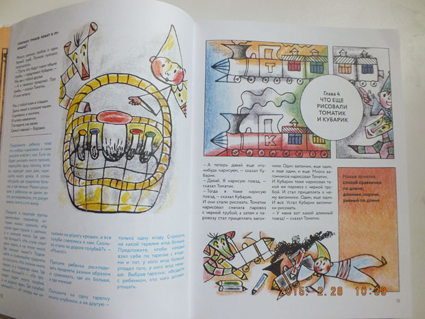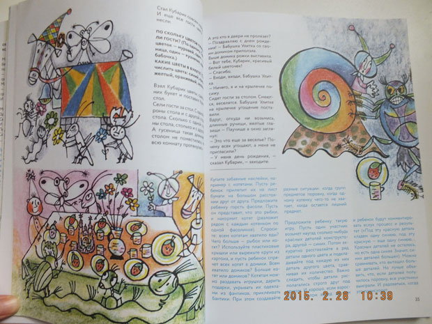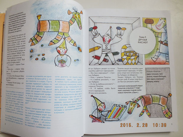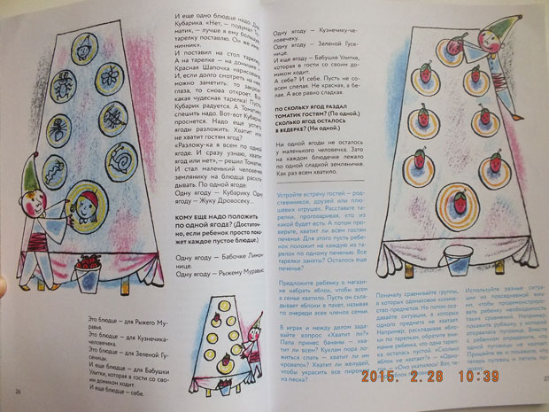 Текст расположен столбцами, рисунки своеобразные. Но удивительно: Сема всегда четко показывает на картинки, кто и что делает. Значит, понятные. Книга гениальная, она в форме сказки знакомит детей с математическими понятиями, это вам не тесты и не задания тематического комплекта. Это СЮЖЕТ. А сюжет дети любят, сами не догадываются, что про математику читают. Причем на основе этого сюжета можно придумать массу своих сказок. Мы иногда просто садимся и играем в прочитанное.