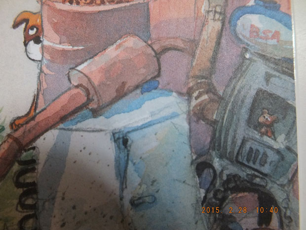Обратите внимание на груду мусора железок. Совсем недавно (вот такой я тормоз) заметила на картинках мышонка. Мы его видели в книге про лодку, а вот оказывается, что он с самого начала жил у них в доме и поехал с ними путешествовать.