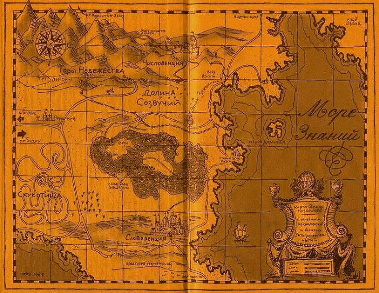 "Карта и вправду оказалась великолепная, красочная, с обозначением главных шоссе, рек и морей, городов и городишек, гор и долин, перекрестков и объездных дорог, а также всяческих достопримечательностей - рукотворных и природных".
