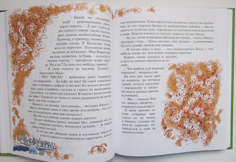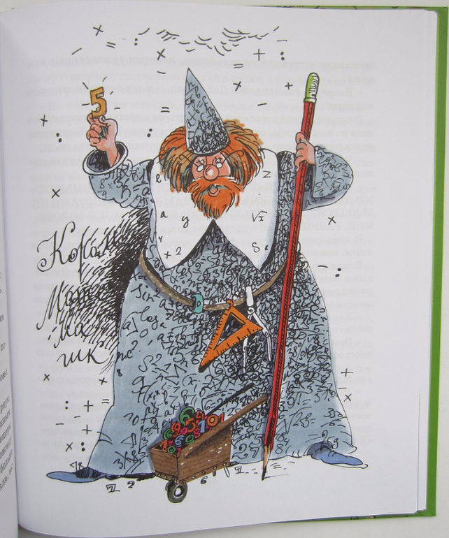 "Но вот однажды распря между братьями перешла все границы. Король Азбукиан твердил, что слово несравненно важнее числа и, стало быть, его королевство несравненно выше; Матемагик же утверждал, что, наоборот, число несравненно важнее слова, а следовательно, именно его королевство превыше. Они спорили, и пререкались, и бранились, и кляли друг друга так, что едва не дошло у них до рукопашной. Тогда порешили они отдать этот вопрос на суд принцессам".