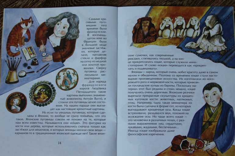 И пойдут перед нами самые разные пуговицы - от обнаруженных в пирамидах Древнего Египта золотых и серебряных дисков, мозаичных пуговиц из Флоренции, до оловянных пуговиц с солдатских мундиров... Для меня большим открытием стало, что всем известные фигурки НЭЦКЕ - ничто иное, как японские пуговицы!