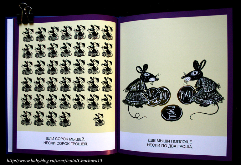 А мыши - какие же они очаровательные. В детстве число сорок мне казалось чем-то огромным! И я представляла такую лавину из мышей, плывущую по городу. А тут все сорок мышей уместились на одной страничке! И ещё, я совсем не знала, что такое гроши. Родители скороговорке-то научили, а объяснить - не объяснили. И мне казалось, что гроши - это горошины)))))