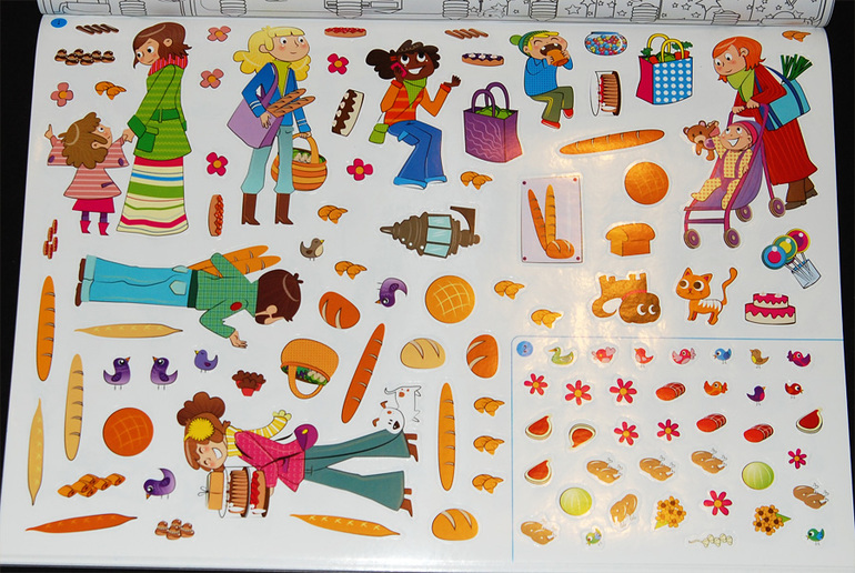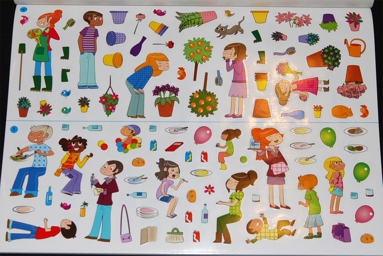 Наклейки глянцевые бумажные с белым ободком. Рисунки позитивные, множество деталей, люди в разных позициях, ситуациях. можно создавать свои сюжеты и сценки. Можно клеить себе в альбом создавая историю. Наклеек очччень много, то есть если заклеивать основу, то еще останется, иначе там уже наклейка на наклейке будет.