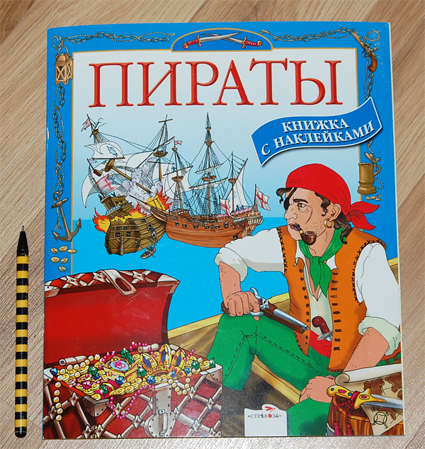 Смешной цены, формата чуть больше А4, с плотным офсетом и наклейками. И любим мы эту книжку про пиратов читать больше чем дорогие энциклопедии с окошками. В книге художественный текст познавательного характера и две страницы красочных наклеек. Давайте посмотрим как это выглядит и как это написано.
