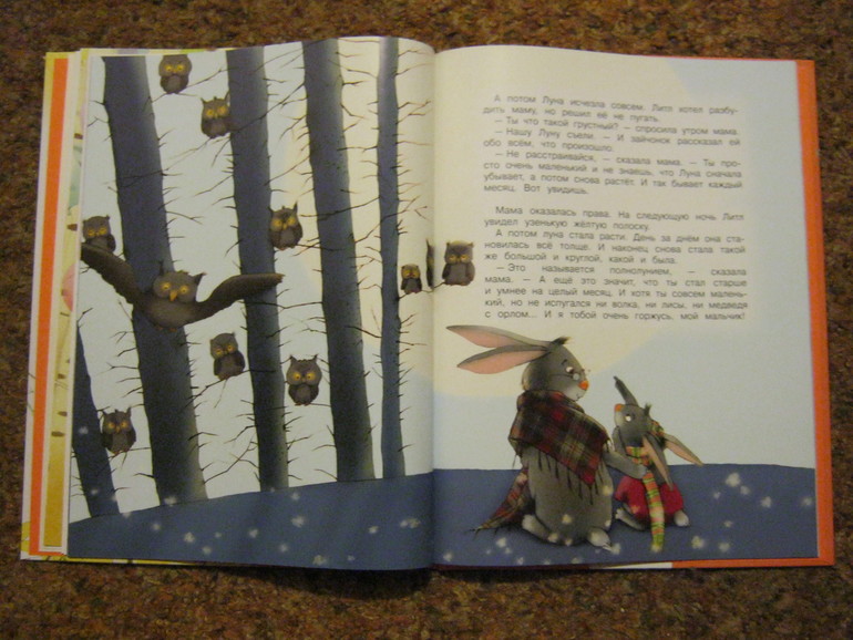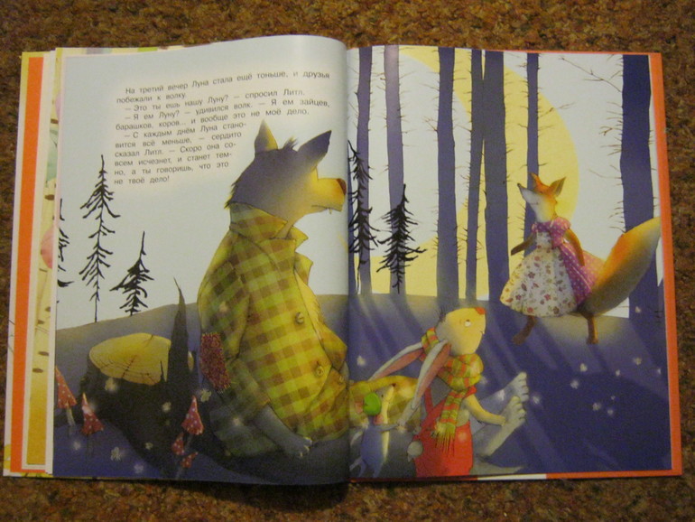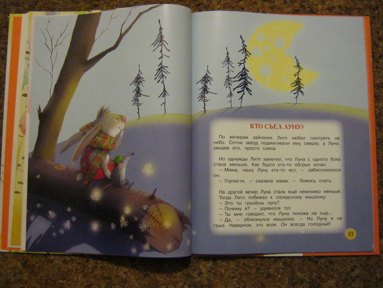 А тут можно придраться к автору - а чего это он отечественного зайчонка обозвал иностранным именем Литл? Мог бы и просто Малышом называть. Но в общем все эти придирки не мешают мне читать книгу детям. И она нам нравится. Эта история прям детективная - зайчонок пытался найти кто ж это каждую ночь на луну покушается - ведь она становится все меньше и меньше...