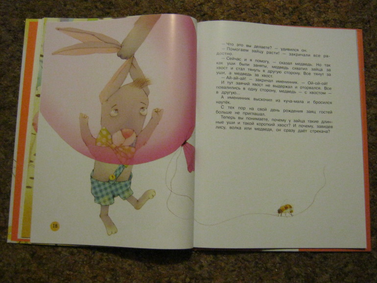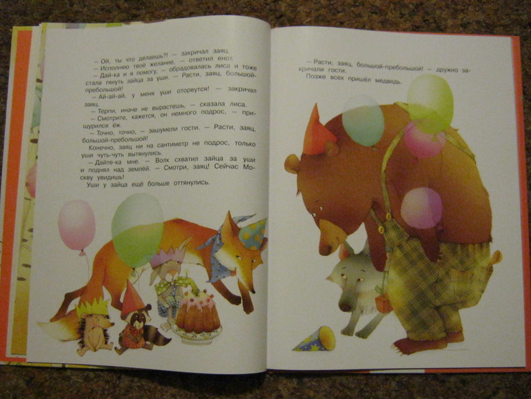 Ну какие тут могут быть тортики, шарики, штанишки с бантиками, да еще и колпачки с коронами, когда в сказке ясно сказано - ПЕРВЫЕ звери, когда еще человек жил в первобытной пещере без компьютера... Но все то, что меня раздражает - короны, колпачки и тортики - детям, наоборот нравится, они уже привыкли к этим атрибутам праздника, любят их, может это примиряет их с тем, что бедному зайке-имениннику оттянули уши и оторвали хвост...