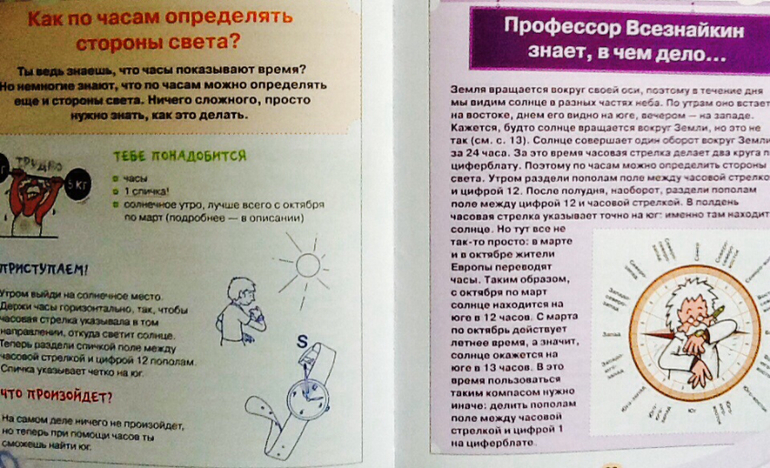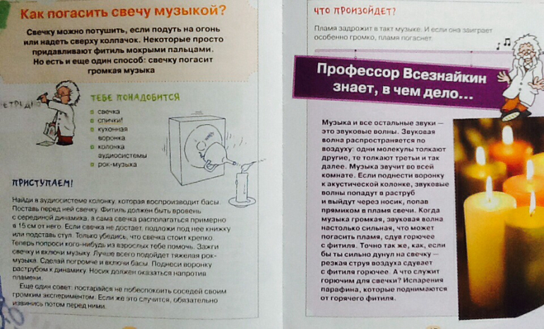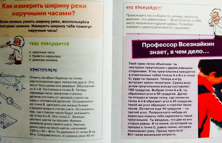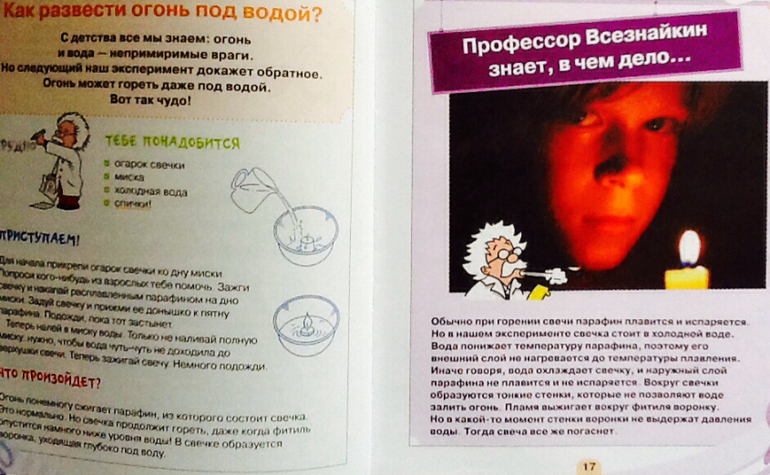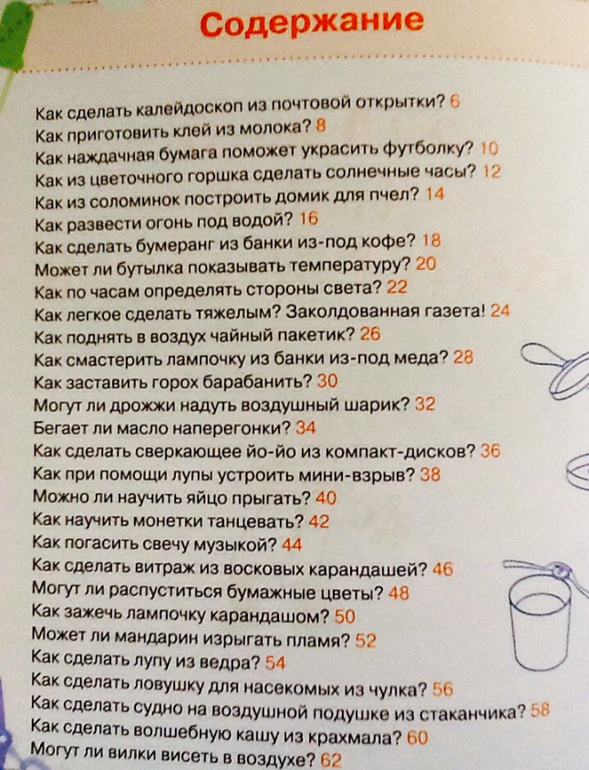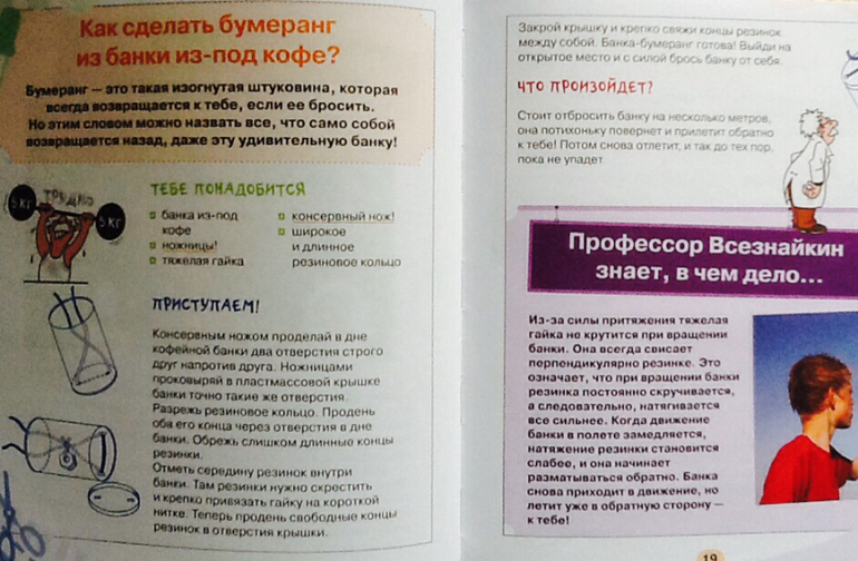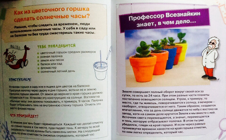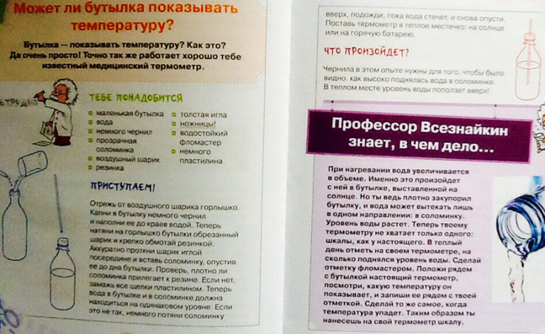 Один разворот - одна новая тема. Опыты, эксперименты, исследования и открытия! + можно самому смастерить много интересных вещей: домик для пчел, сверкающее йо-йо, калейдоскоп и много чего еще. В начале каждой новой темы профессор Всезнайкин «дает» список всего необходимого, что может понадобится при проведении опыта. Все необходимые компоненты и оборудование очень просты и всегда найдутся «под рукой». К каждой теме есть указатель степени тяжести: легко, нетрудно и трудно.