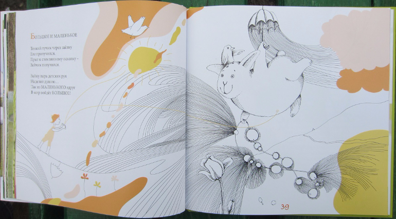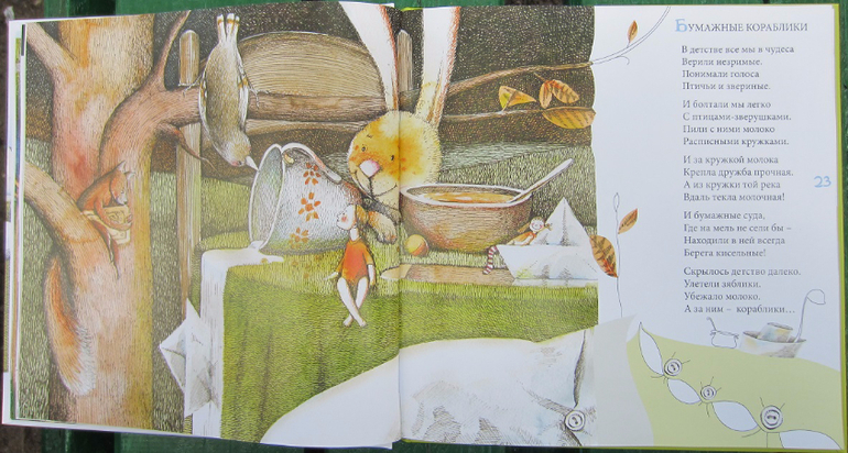 Удивительный мир на иллюстрациях. Он и детский, и совершенно недетский. Он сюрпризный, он уютный, очень тёплый))) Даже острые углы там не кажутся острыми. Всё мягко-плавно, одно перетекает в другое, как наши мысли. Не успел остановиться на одной, перекинулся на другую... По страницам ходят-бродят смешные зайцы, коты и другие зверюшки, заглядывают, подглядывают, наблюдают. Там всё в движении, в действии, но в то же время они не стремительные,а какие-то неторопливые... Покажу любимые развороты, скопирую понравившиеся стихотворения, а вдруг...