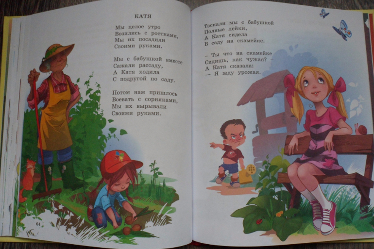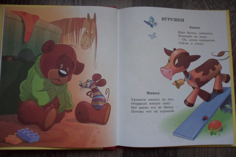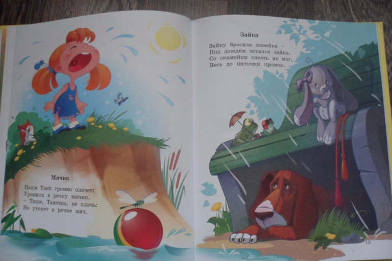 Вряд ли есть человек, который не знает хоть несколько строк из поэзии Агнии Барто "Наша Таня громко плачет.." вот и я не исключение))) Мне с детства нравились ее произведения, поэтому своему маленькому сыночку я рассказываю именно ее стихи. И вот, однажды вечером, брожу по простом сети и вижу замечательную книжку Агнии Барто, с просто великолепными иллюстрациями художника Сони Карамелькиной, такие простые и добрые) Далее несколько разворотов: