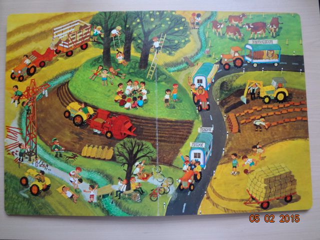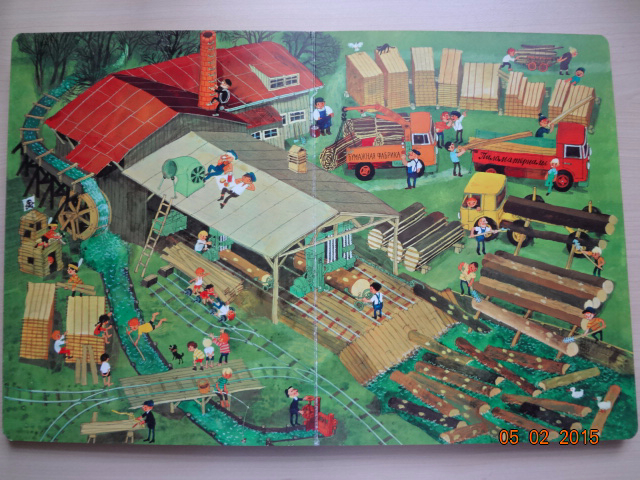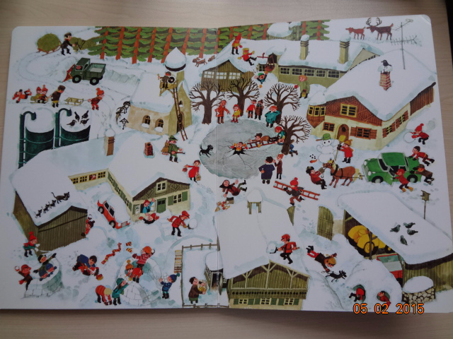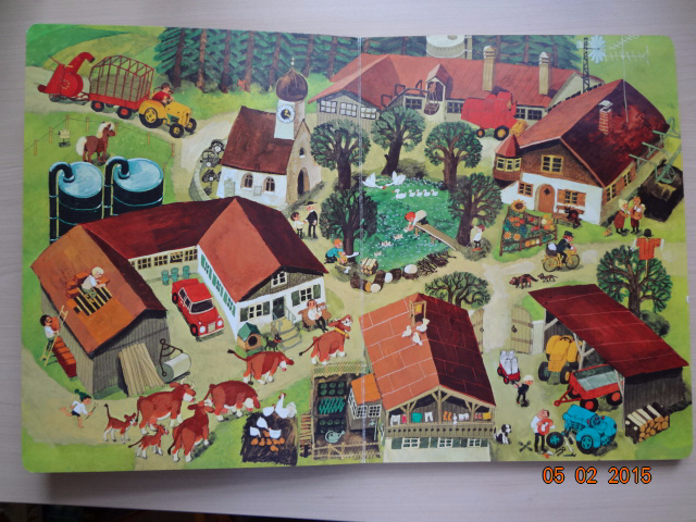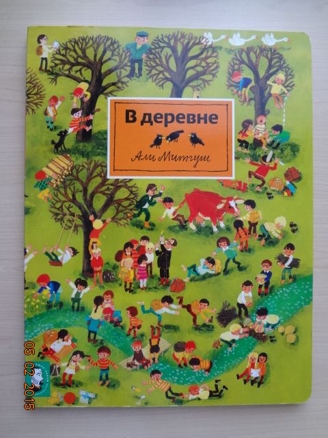 "В нашей деревне есть ферма с множеством животных, дома, церковь и речка. И везде что-то происходит! Вот один фермер начинает постройку дома, а другой мастерит чучело. На одном из разворотов мы находим отдельные картинки с подписями к ним. Здесь есть свинья, корова и кошка, а рядом трактор и прицеп, топор и бензопила, словом все то, что можно встретить на ферме. Потом художник изобразил сцены работы на лесопилке, в поле, на дворе дома. На последнем развороте в деревню приходит зима. Здесь можно посмотреть, как дети катаются на санках и копают снег. Вот какая-то женщина поскользнулась, выронила сумку и ее покупки раскатились по льду. Жизнь в деревне - это большая и благодатная тема, особенно для детей. Каждая страница в книге Али Митгуша буквально переполнена действиями и различными предметами. Отправимся в путешествие по ее большим картонным разворотам, погружаясь в мир цветущих лугов и полей, наполненных свежим ароматом, мир детских игр на природе".![]()