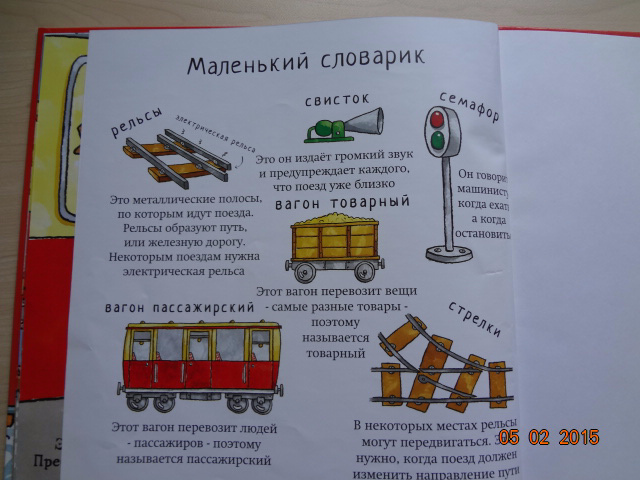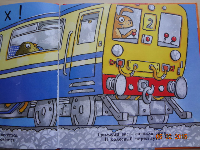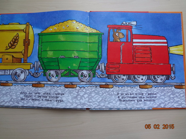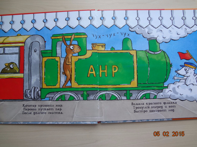 Читали регулярно перед сном. Сын задавал вопросы по тексту: кто там сидит в вагоне, а что у птички в руках и т.д. Благодаря книге сын выучил некоторые термины - кочегар, свисток, семафор. Стихотворение очень динамичное, насыщенное действием и новыми словами. Может поэтому книга так нам полюбилась. После ее прочтения мы строили железную дорогу из Лего и разыгрывали всё по книге)![]()